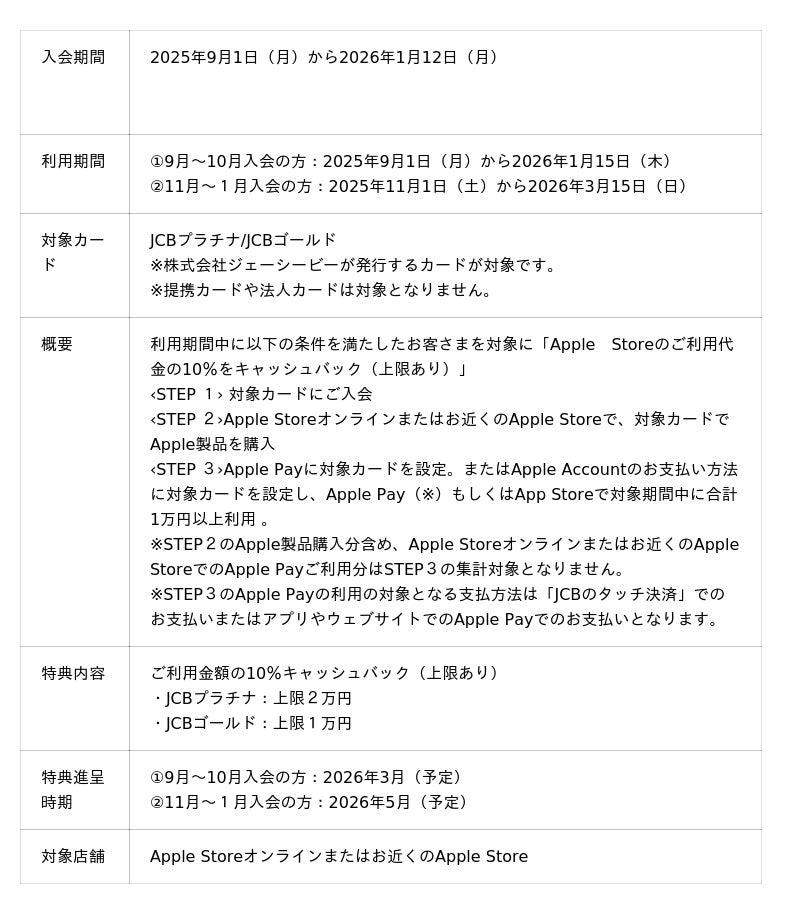 株式会社ジェーシービー (本社:東京都港区、代表取締役会長兼執行役員社長:二重 孝好、以下:JCB)は、2025年9月1日(月)から2026年1月12日(月)の間に、JCBプラチナもしくはJCBゴールドに新規入会されたお客様を対象に、「Apple Storeのお買い物でご利用金額の10%キャッシュバックキャンペーン」を実施します。※キャッシュバックには上限があります。