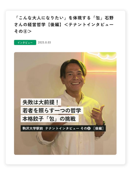 住民の生活に寄り添い、自宅の延長ともなる「離れ」のような施設のあり方をデザインしています。17店舗と、駒沢に住む人、働く人、学ぶ人のつながりが育つようにと、ウェブマガジン『今日の駒沢』ではテナントインタビューの記事も続々と展開中。