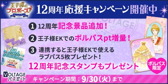 株式会社ボルテージ(本社:東京都渋谷区 代表取締役:津谷 祐司)は、提供中のボル恋タイトル「王子様のプロポーズ Eternal Kiss」が今年9月に配信12周年を迎えることをお知らせいたします。
