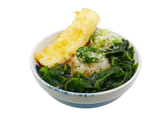3種の薬味(おろし・大葉・みょうが)と、たっぷりのわかめが色合いも美しく、食欲をそそる一品。自慢のつゆとコシのあるそばが絶妙にマッチします。さらに、いか天がアクセントとなり、満足感のあるこの商品は、映画の世界観を感じられる一杯です。