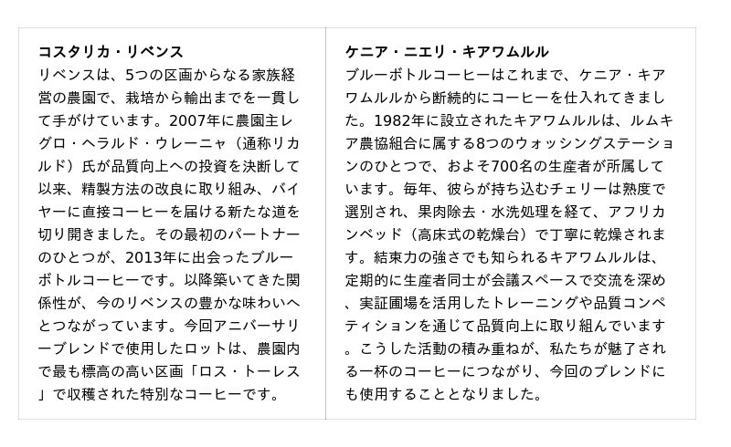 これまで支えてくださったみなさまと共に、この節目を分かち合えることに心より感謝を込めて。特別なアニバーサリーブレンドで、心あたたまる時間をお過ごしいただけたら嬉しいです。ブルーボトルコーヒーはこれからも豊かなコーヒー体験をお届けしてまいります。