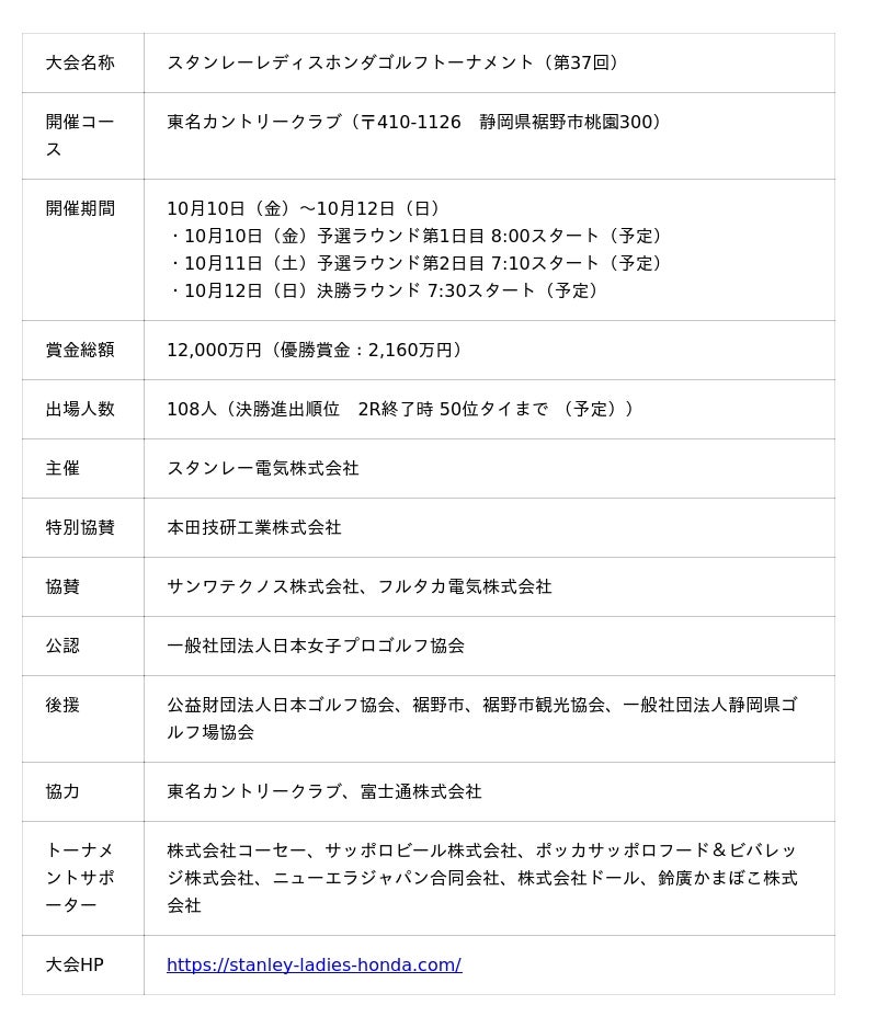 スタンレー電気株式会社(本社:東京都目黒区中目黒 2-9-13、代表取締役社長:貝住泰昭)と本田技研工業株式会社(本社:東京都港区虎ノ門2-2-3、代表執行役社長:三部敏宏)は、2025年10月10日(金)から同12日(日)までの3日間、静岡県裾野市の東名カントリークラブにて、日本女子プロゴルフ協会公認競技となる「第37回 スタンレーレディスホンダゴルフトーナメント」を開催いたします。