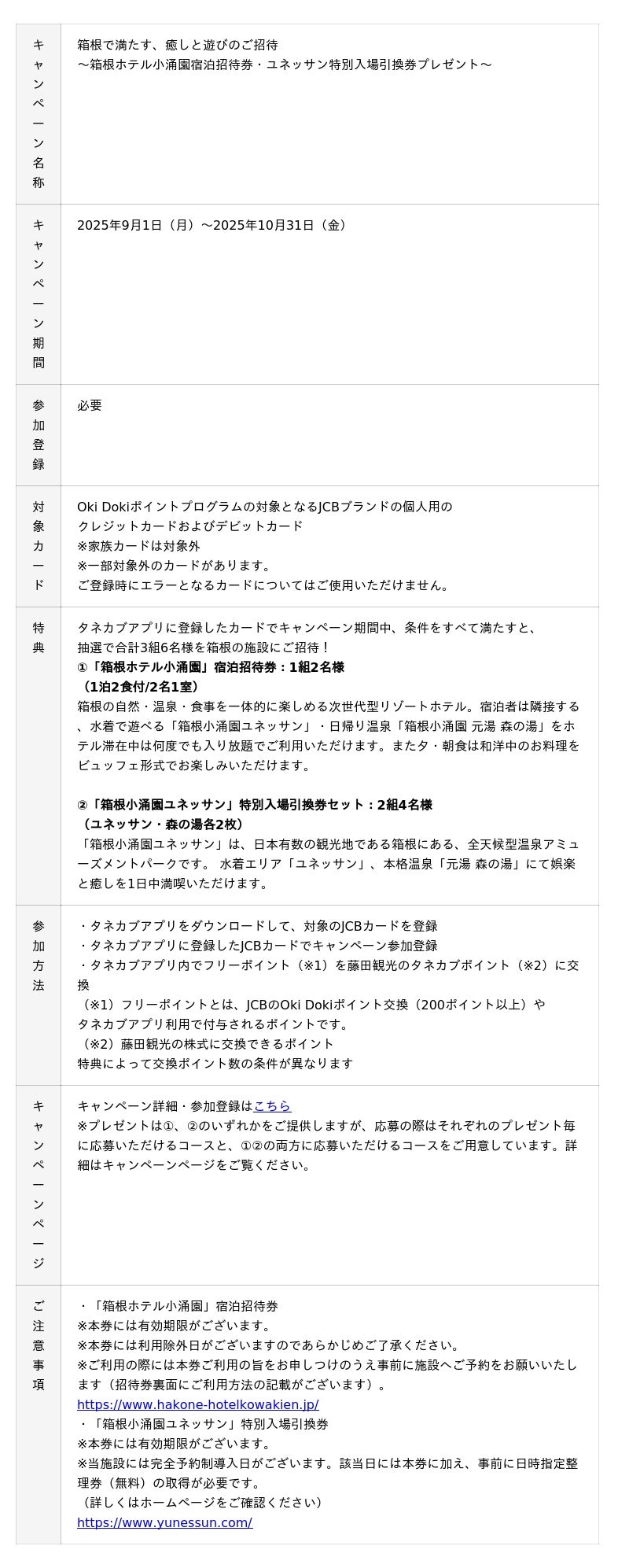 株式会社ジェーシービー (本社:東京都港区、代表取締役会長兼執行役員社長:二重 孝好、以下:JCB)は、1株からの株式投資体験を通じて企業のファン育成を支援するポイント投資アプリ『タネカブ』に参画する藤田観光株式会社(本社:東京都文京区、代表取締役兼社長執行役員:山下 信典、以下:藤田観光)と共同して、「箱根で満たす、癒しと遊びのご招待~箱根ホテル小涌園宿泊招待券・ユネッサン特別入場引換券プレゼント~」を実施することをお知らせいたします。