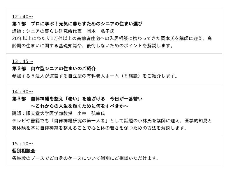 本イベントは、自立型の有料老人ホームを長年にわたって管理・運営し、信頼と豊富な実績を持つ5法人が一堂に会します。シニア世代にとって、住まい選びや複数施設の情報、健康づくりに関する情報を得られる大変貴重な機会です。