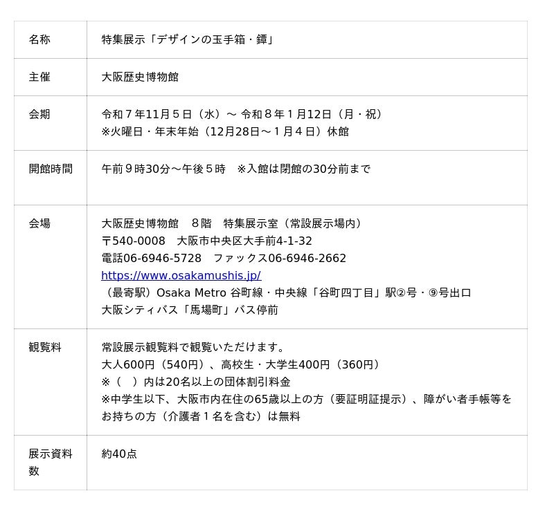 大阪歴史博物館では、令和7年(2025)11月5日(水)から令和8年(2026)1月12日(月・祝)まで、8階特集展示室において、特集展示「デザインの玉手箱・鐔」を開催します。