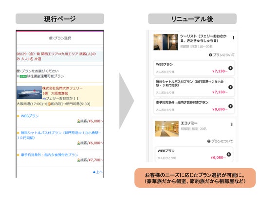 従来はプランを選択後に船室を選ぶ動線でしたが、リニューアル後は船室に応じたプランの料金を表示しました。これにより、お客様が希望する船室ごとの料金比較が一目で確認できるようになり、スムーズに予約手続きを進めることができます。