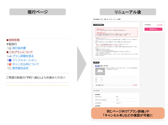 従来は予約内容の確認ページで「プラン詳細」や「キャンセル料」などを確認する際、別のページに切り替わる作りでした。リニューアル後は、ページが切り替わることなく同じページ内で確認ができるため、必要な情報をスムーズに確認いただけるようになりました。