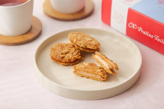 アーモンドの香りと風味を最大限に引き出すために、自家挽きしたアーモンドパウダーとスライスアーモンドの2種類を贅沢に使用したチュイルクッキーに、なめらかで香り豊かなヘーゼルナッツプラリネクリームをサンドしました 。アンデス山脈で採掘された、旨味と塩味のコントラストがはっきりした「アンデス紅塩」が香ばしいチュイルの旨味を引き立て、バランスのとれた甘じょっぱさが味わえます。