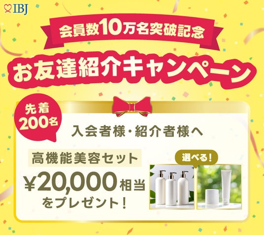 IBJでは、つながるご縁への感謝を込めて、会員数10万人突破を記念した「お友達紹介キャンペーン」を開催します。お友達の紹介でご入会いただいた方と紹介者の双方に、2種類から選べる高機能美容セットをプレゼント。先着100組(合計200名様)限定の特別企画です。