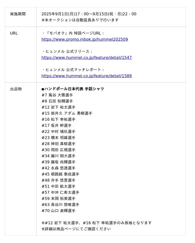 株式会社モバオク(本社:東京都渋谷区、代表取締役社長:小一原 宏樹、以下モバオク)が運営するオークションサービス「モバオク」にて、株式会社エスエスケイ(以下、エスエスケイ)が実施する「ハンドボール日本代表×ヒュンメル 手話シャツ チャリティーオークション」を、2025年9月1日(月)から開始いたします。