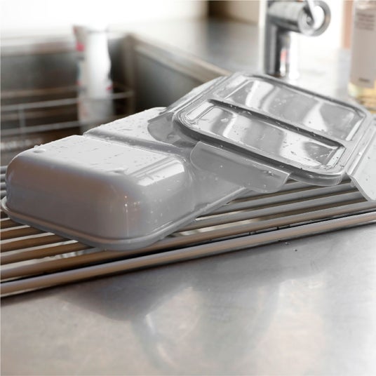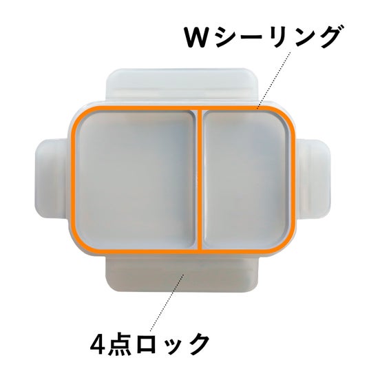 フタと本体の周囲+中仕切りの2段階でしっかり密閉。さらに4点ロックで固定することで、持ち運び中の汁漏れリスクを最小限に抑えます。