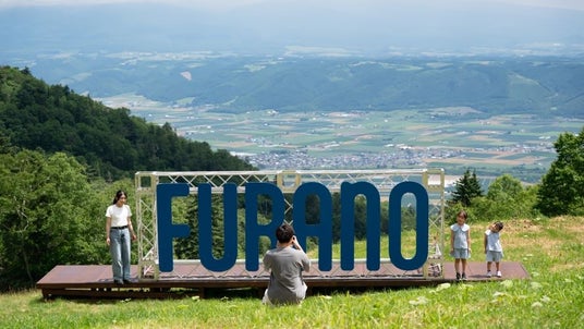 十勝岳連峰を背景に「FURANO」の文字が映えるモニュメントを設置しています。旅の思い出になる