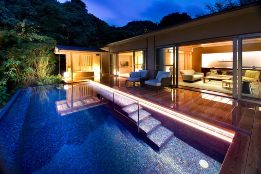 ABBA RESORTS IZU-坐漁荘は、静岡県伊豆高原・浮山温泉郷に広がる約6,000坪の敷地を有する高級温泉旅館です。静寂に包まれた環境の中、本館・離れ・ヴィラ棟など多彩な客室を展開し、全室に温泉を完備。中でもヴィラ棟にはプライベートプール付きの客室もあり、贅沢な滞在を叶えます。
