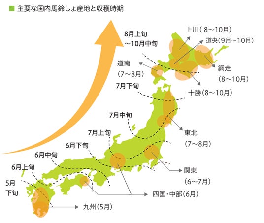 じゃがいもは、地域によって収穫時期が異なります。南の地域ほど早く、梅雨前線や桜前線のように“じゃがいも収穫前線”が北上していきます。