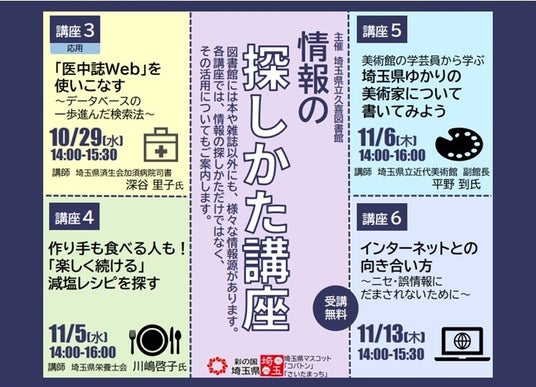 県立久喜図書館では、健康・医療や栄養、美術など各分野の専門家や当館の司書が講師となり、情報の探し方や内容の見極め方、情報の活用法などを学ぶ各種講座を開催します。
