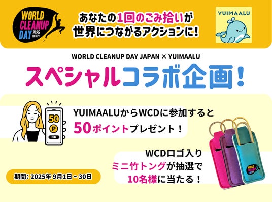 このたび、一般社団法人くらげれんごう(所在地:福岡県、以下「くらげれんごう」)が運営する、ごみ拾いポイントアプリ「YUIMAALU(ゆいまーる)」は、NPO法人ワールドクリーンアップデージャパン(所在地:東京都、以下「WCD Japan」)が推進する「ワールドクリーンアップデー」と連携し、2025年9月に特別企画を共同で実施することをお知らせいたします。