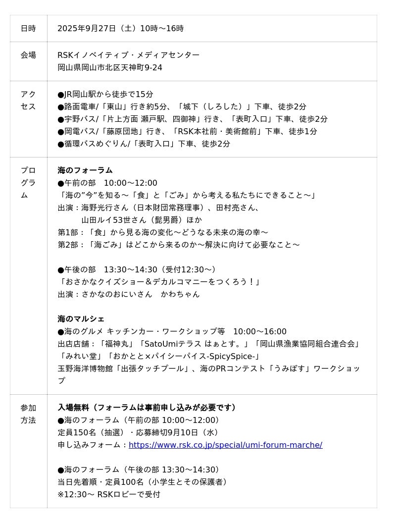 一般社団法人海と日本プロジェクト in 岡山は、9月27日(土)に「海のフォーラム&マルシェ in RSK」を開催いたします。このイベントは、次世代へ豊かで美しい海を引き継ぐために、海を介して人と人とがつながる“日本財団「海と日本プロジェクト」”の一環です。