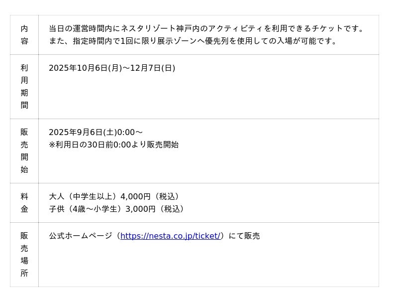 ※各アクティビティの運営時間はネスタリゾート神戸公式ホームページ(https://nesta.co.jp/)にてご確認ください。来場時間によっては、各アクティビティの受付・運営が既に終了している場合もございます。