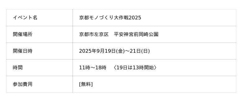 京都発のクリエイター・地域企業・学生達が大集結する「京都モノづくり大作戦」2025年9月19日(金)~21日(日)に開催。美濃焼食器、下駄ラボ、宇治茶体験や輪ゴム銃作りなど参加型企画が盛りだくさん!