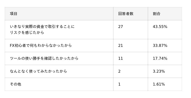 - デモトレードを利用した理由として最も多かったのは「いきなり実際の資金で取引することにリスクを感じたから」(43.55%)。投資による資金減少を不安に思う人は少なくないといえる。