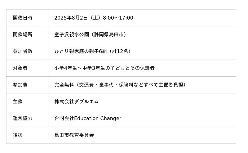 静岡県島田市の童子沢親水公園を会場に、親子6組(計12名)が参加し、島田市教育委員会の後援のもと、BBQや川遊びなどのアクティビティを通じて夏休みの貴重な親子時間を過ごしました。