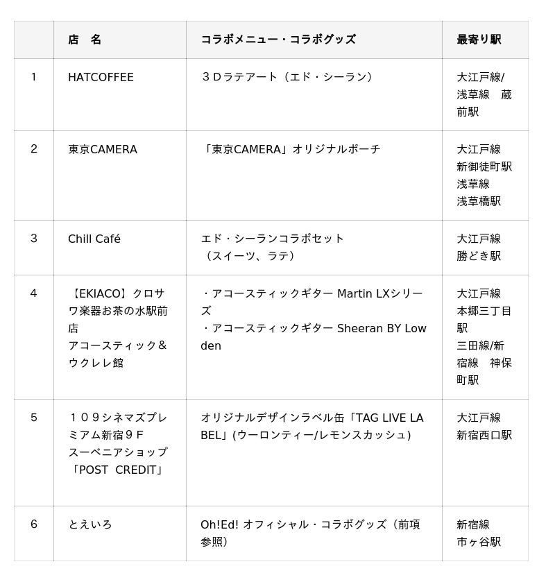 Oh!Ed!キャンペーンオフィシャルコラボグッズを、スタンプラリースポット・景品交換所となっている都営交通沿線セレクトショップ「とえいろ」限定で販売します。アイコニックでカワイイロゴ入りTシャツ、タオル、キーホルダーのほか、コラボロゴ入りケースのアルバム『プレイ』もご用意しました!さらに、キャンペーン期間中は店舗がエド・シーラン仕様に大変身!外装はフォトスポットとして楽しめる、ファン必訪のスペシャルなお店になります。