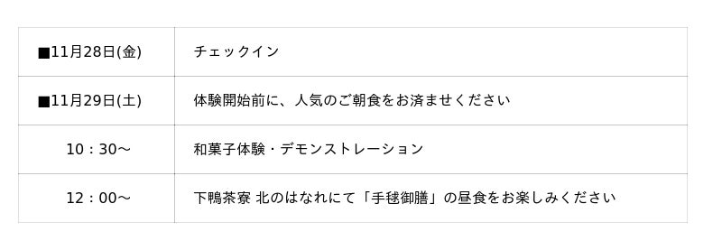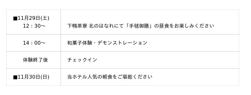 11月28日宿泊のお客様は、和菓子体験が始まる前にチェックアウトをお済ませください。
