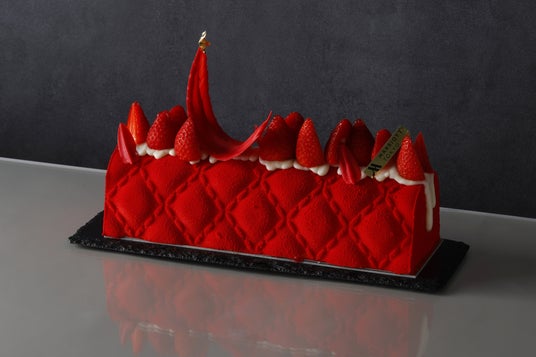 鮮やかなレッドのキルティング紋様が目を引くブッシュドノエル。甘酸っぱいいちごとラズベリーのジュレにコク深いピスタチオクリームを重ね、北海道産の粉乳とエクアドル産カカオバターをブレンドしたミルキーな味わいの自家製ホワイトチョコレートのムースで包み込みました。