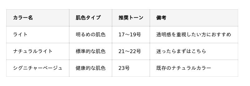 肌トーンに合わせて選べるようになり、「色が合わない…」というお悩みを解消し、より自然な仕上がりへ。