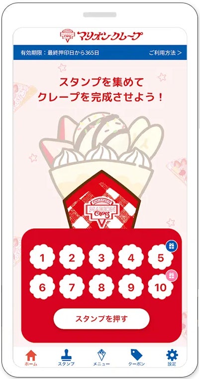 クレープ1点ご購入につき1スタンプを付与。スタンプが5個貯まると50円OFFクーポン、スタンプが10個貯まるとクレープ引換券クーポンをプレゼント。