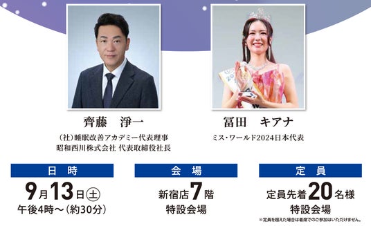 当社代表取締役社長であり、(社)睡眠改善アカデミー代表理事を務める齊藤淨一とミス・ワールド2024日本代表・冨田キアナさんが多彩な視点から質の良い眠りについて語り合いながら、日本人の睡眠の現状と快眠の秘訣についてわかりやすくお伝えいたします。