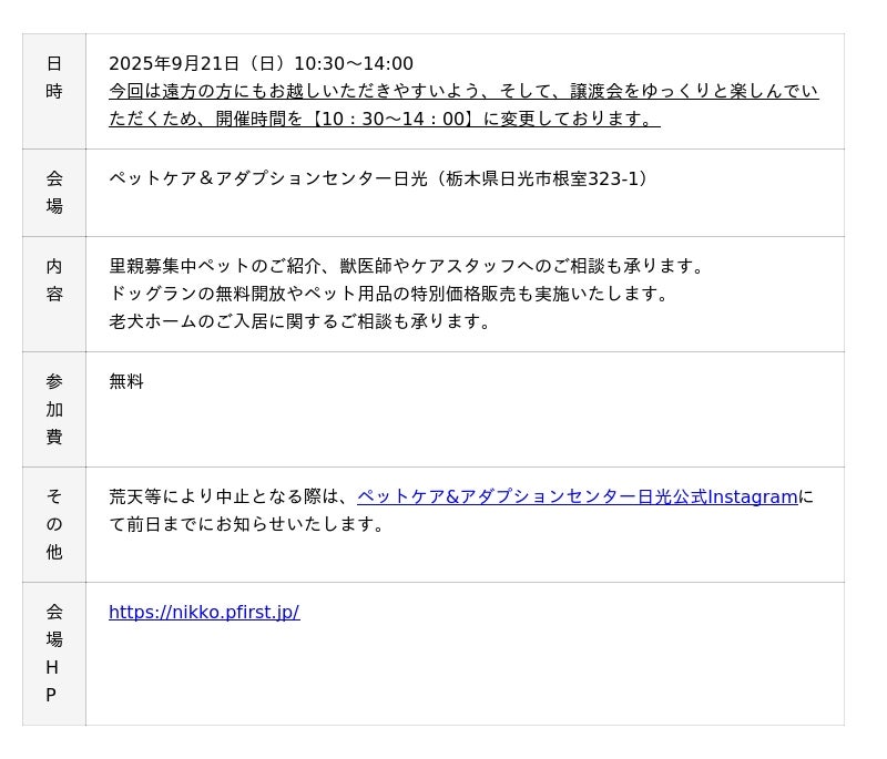 2025年9月21日(日)ペッツファーストグループ「ふれあい譲渡会」開催のお知らせ inペットケア&アダプションセンター日光