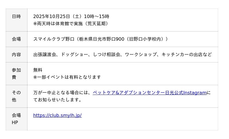また、2025年10月25日(土)には、栃木県日光市野口にあるスマイルクラブ野口にて、ドッグイベント「ドッグフェスタNIKKO」を開催いたします。