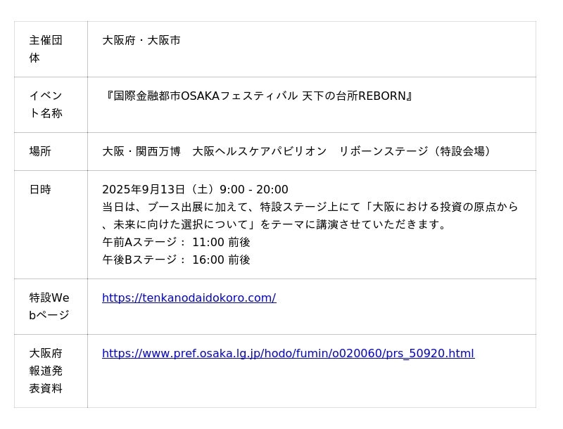 9月13日(土)当日は、ブース出展に加えて、特設ステージ上にて「大阪における投資の原点から、未来に向けた選択について」をテーマに講演させていただきます。