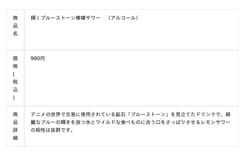 キャラクターやアニメのエピソードにちなんだアルコールとノンアルコールドリンクを8種ラインナップ。エピソードに想いを馳せながら串かつをはじめ、コラボならではのメニューやデザート、ドリンクを是非お楽しみください。