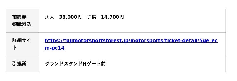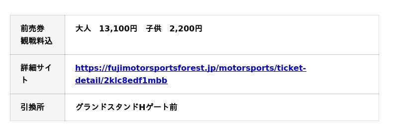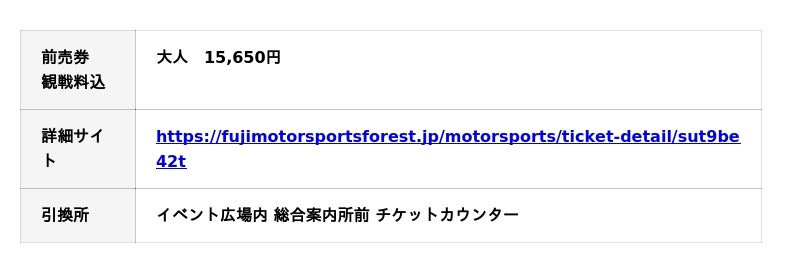 富士スピードウェイへのご入場および、自由観戦エリアやスタンド席エリアでご観戦いただけるチケットです。