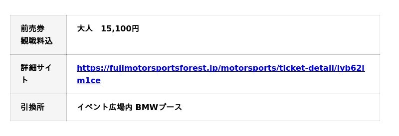 BMWファンにオススメの自由観戦エリア機能に特典が付いたチケットです。