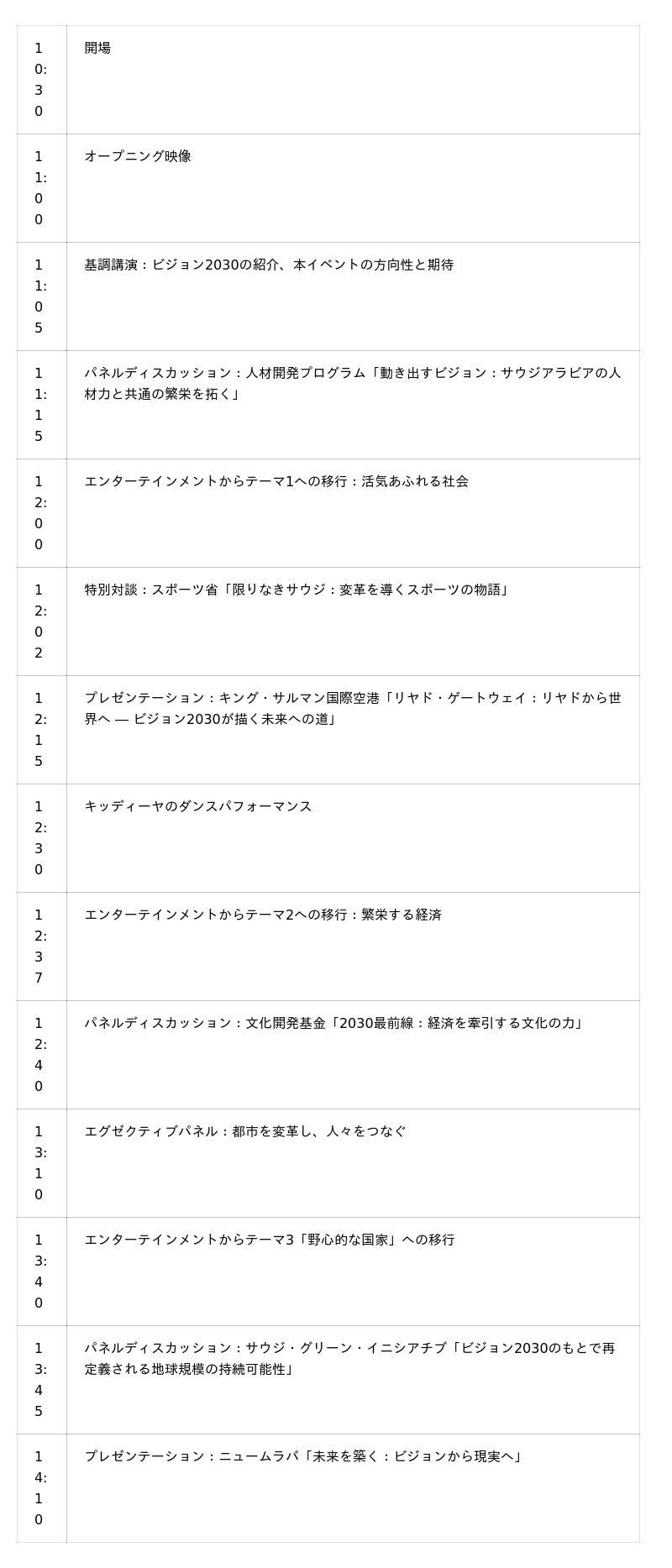 ●フォーラムでは、サウジアラビアから先見性あるリーダーが集い、「ビジョン2030」の目標達成に寄与する数々の画期的なプロジェクトやプログラムを、パネルディスカッション、短編映像、プレゼンテーションを通じて紹介します。