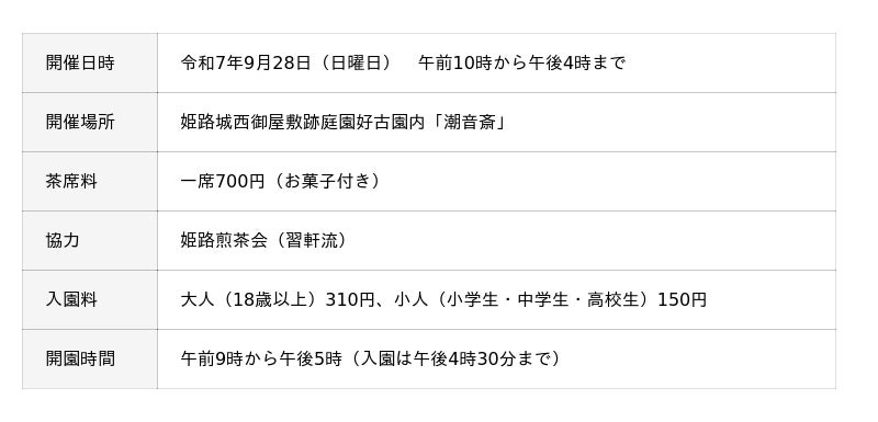 潮音斎にて煎茶道のお茶会を開催し、お点前を披露します。庭園を眺めながら、どなたでも気軽に楽しめるお茶会です。