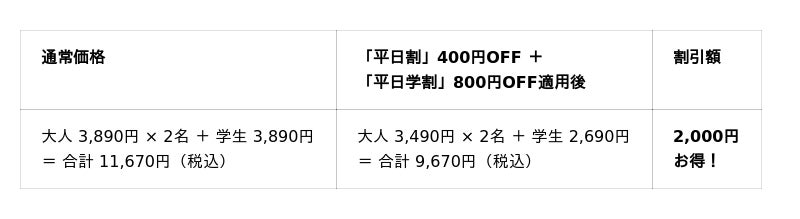一般:4,190円(税込)⇒「平日割」と「平日学割」適用で2,990円(税込)