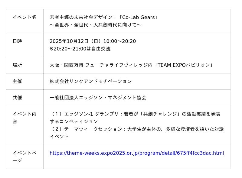 株式会社リンクアンドモチベーション(本社:東京都中央区、代表:小笹芳央、証券コード:2170、以下当社)は、万博の最終日前日である10月12日(日)、大阪・関西万博内の「TEAM EXPOパビリオン」にて、若者による「共創チャレンジ」の成果発表と、大学生と多様な登壇者との対話を通じて、未来社会を共に描くイベントを開催します。