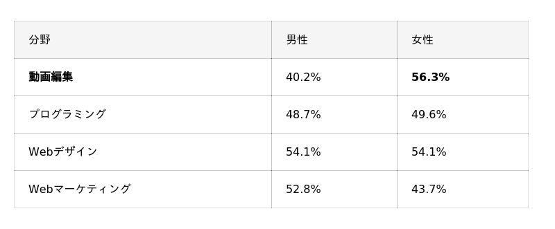 その結果、「動画編集スクール」の受講者は女性が56.3%で過半数となり、「コエテコキャンパス byGMO」で実施したプログラミング(女性49.6%)、Webデザイン(女性43.9%)、Webマーケティング(女性43.7%)の調査結果と比べて、唯一「女性が多数派」の分野であることが分かりました。