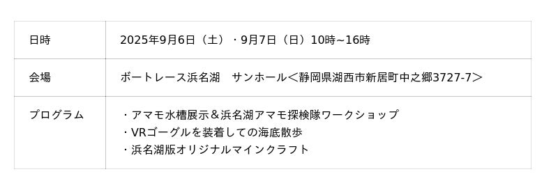一般社団法人 静岡UP 浜名湖ワンダーレイク・プロジェクトは、2025年9月6日(土)と7日(日)にボートレース浜名湖にて開催された「見て知って感じて はまなこSHOW 2025」に出展しました。今回の展示では、浜名湖の豊かな生態系を支える「アマモ」の役割や魅力を楽しく学ぶため、3つの企画を実施しました。1つ目は、実際に浜名湖に生えているアマモを観察できる「出張アマモ水槽」を展示。2つ目は、VRゴーグルでの3D海底散歩も体験していただきました。また3つ目、教育版マインクラフトを活用し、浜名湖を舞台にした新開発の特別ゲーム「メタモバース」で世界初となるブルーカーボン・シミュレーションゲームを体験していただきました。ゲームの世界で遊んだあとにすぐ水槽に生えたリアルなアマモを観察することで、アマモが浜名湖の生態系の維持に役立っていることについて、多くの子どもたちに学んでいただきました。