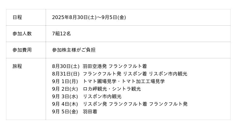 カゴメ株式会社(本社:愛知県名古屋市 代表取締役社長:山口 聡)は、企業理念の一つである「開かれた企業」の実践として、株主との対話と交流の機会を大切にしています。近年、対話の場において、国際事業の展開や、サステナビリティへ取り組みに高い関心をいただいていることを受け、2023年より個人株主の方を対象にした海外拠点見学ツアーを開催しています。本年8月30日(土)~9月5日(金)にはポルトガル・リスボンの圃場や生産拠点への見学ツアーを開催しました。