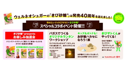 きび砂糖(R)発売40周年のウェルネオシュガーのファミリー向けのワークショップや抽選会などを実施。きび砂糖(R)を使用したフード&スウィーツタイアップメニューも登場! ※抽選会にはBeer&Foodチケットの半券が必要です。※9/20(土)21(日)のみ。