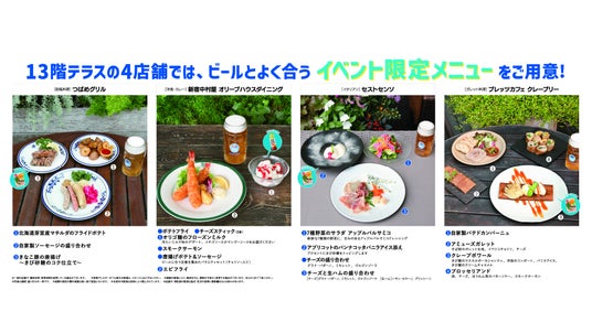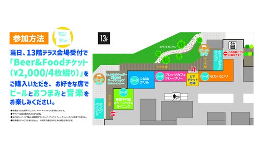 13階のテラス入り口でBeer&Foodチケットをお買い求めいただき、各店舗やビール売り場でオーダーしてください。お席は自由ですので混雑時は先にお席の確保をお願いします。※店舗内のお席は使用できません ※各店舗店頭にてフードオーダーをしてください。※会場内はセルフサービスとなります。