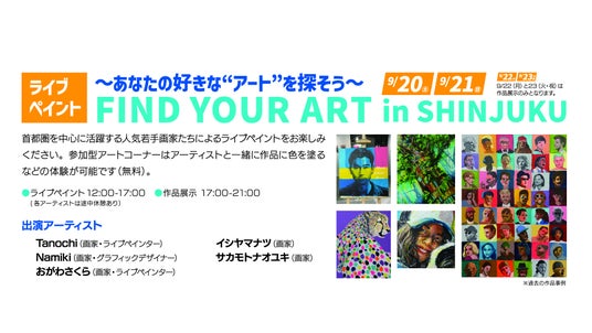 5人のアーティストが9/20(土)21(日)の両日に会場でライブペイントを披露いたします。また、お子様とアーティストが一緒に作品に色を塗ることができる参加型の体験イベントもあります。