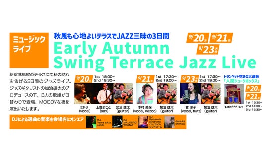 9/20(土)21(日)にファミリーでお楽しみいただける「人間ジュークボックス タカパーチ」が登場! 夜は雰囲気をガラッと変えて加治雄太率いる日替わりユニットがメローなJAZZライブを繰り広げます。