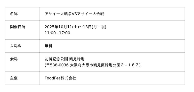 FoodFes株式会社(代表取締役:稲垣一馬)は2025年10月11日(土),12日(日),13日(月)の3日間「アサイー大戦争VSアサイー大合戦」を花博記念公園 鶴見緑地(大阪市鶴見区)にて開催いたします。