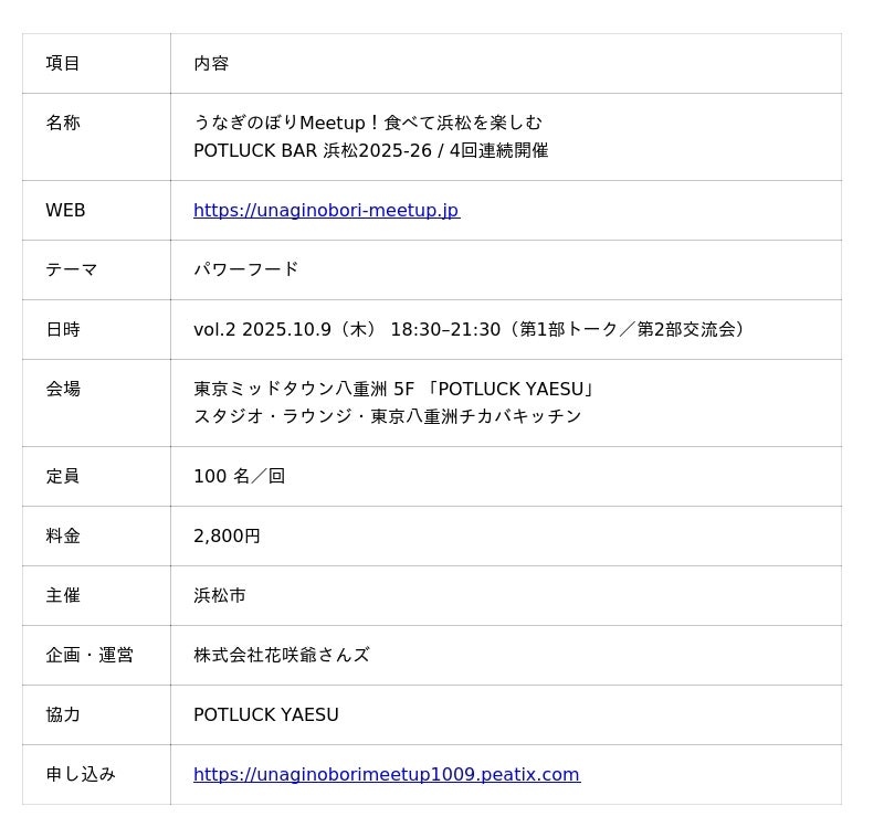 浜松市観光・シティプロモーション課は、東京・八重洲にて、浜松の旬を味わいながら交流する全4回の企画『食べて浜松を楽しむ うなぎのぼりMeetup!POTLUCK BAR 浜松2025-26』を開催しています。